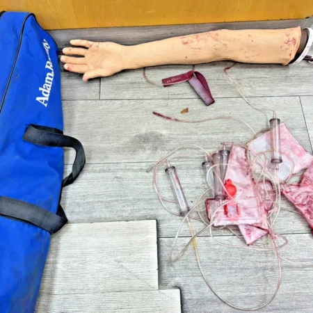 Realistic left-arm model for venepuncture, IV cannulation, infusion, and injection practice. Features palpable veins, durable silicone skin, flexible wrist, and artificial-blood system with flash-back. Ideal for nursing, medical, and clinical skills training. Compatible with standard needles up to 21G.