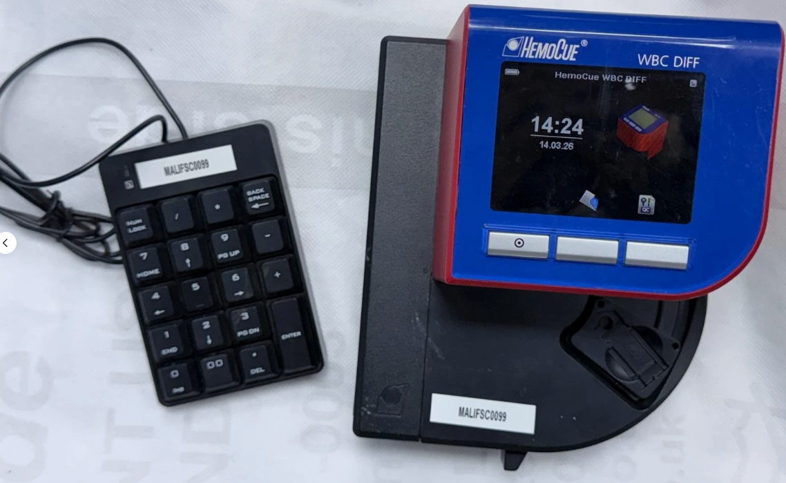 The HemoCue® WBC DIFF is a sophisticated, portable point-of-care analyzer designed for rapid white blood cell counting. This specific setup is optimized for high-efficiency data entry and mobile use.